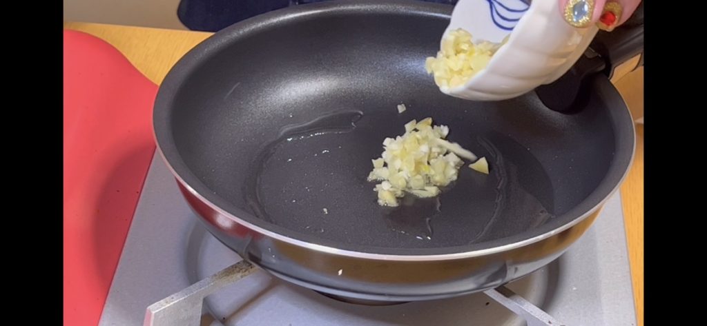 フライパンに油をひいて、弱火でニンニクと生姜を炒めます。