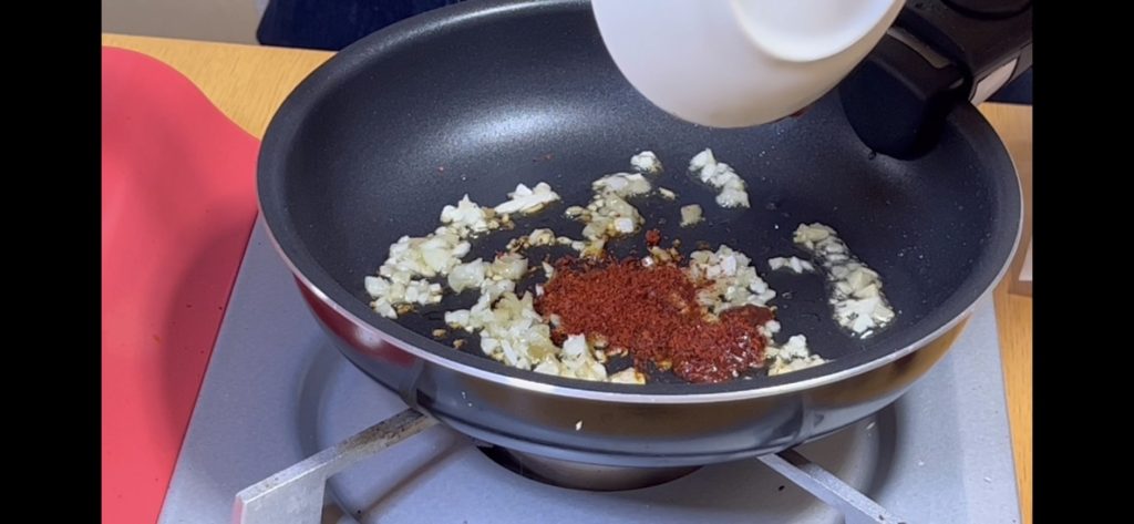 一味唐辛子、豆板醤を小さじ半分ずつ入れます。