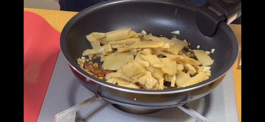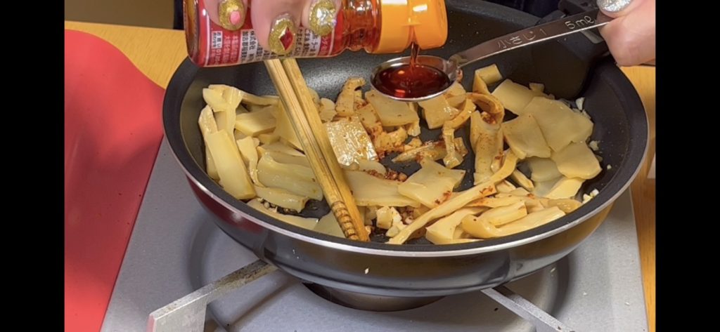 水を抜いたメンマを入れます。メンマを入れたら弱火から中火に変えます。