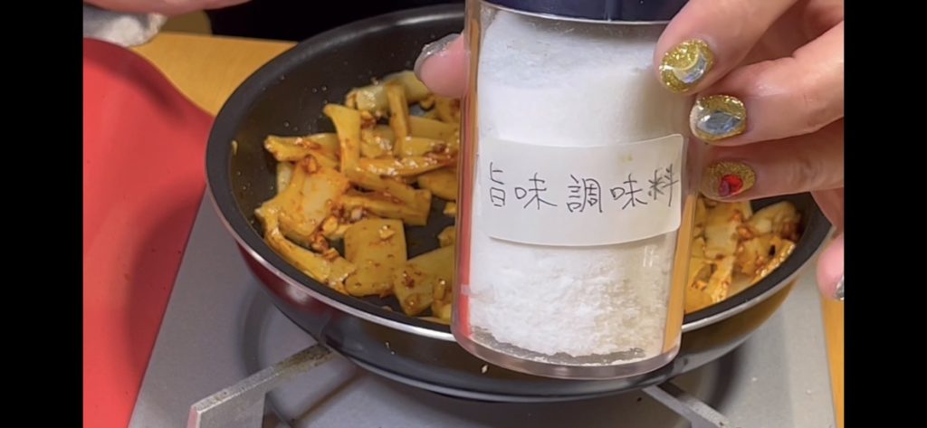 よくかき混ぜて、ある程度色が均等になったら、旨味調味料を3振り入れます。この旨味調味料が味の決め手となります。