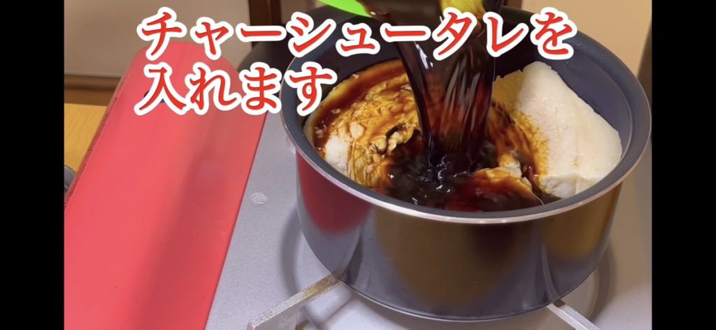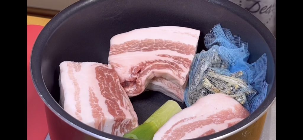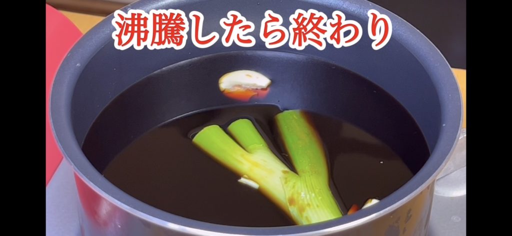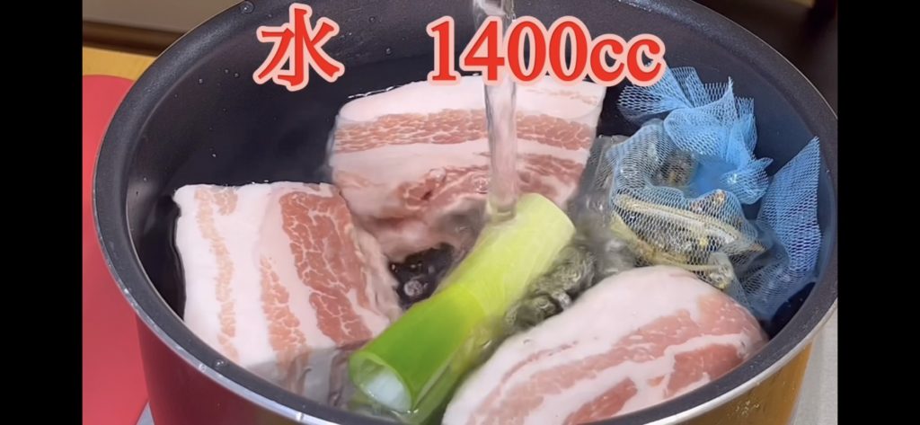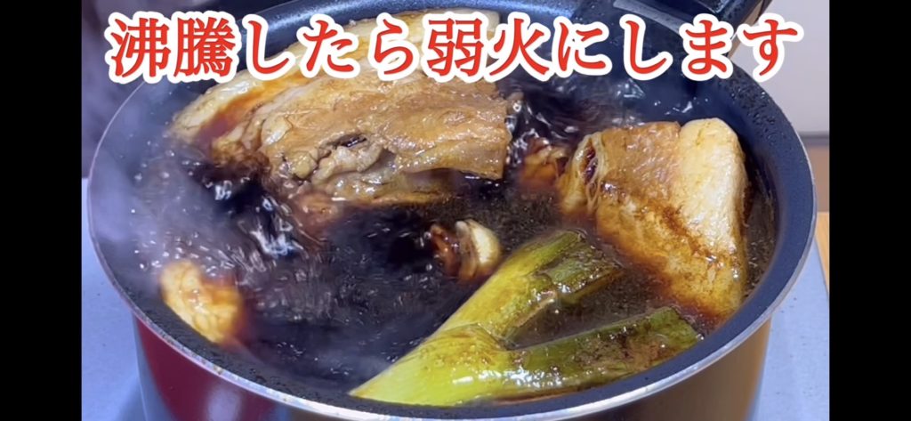 そしたら調味料を全部入れます。火を付けて沸騰したら豚バラブロックが出来るまで、休ませます。