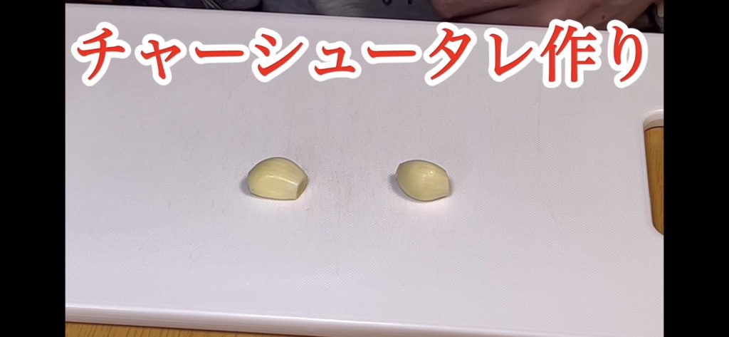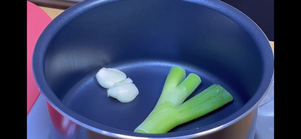 ニンニクを包丁で潰して、ニンニク、ネギの頭を鍋に入れます。