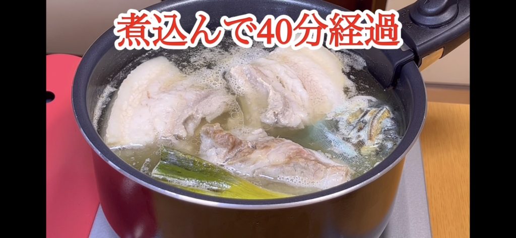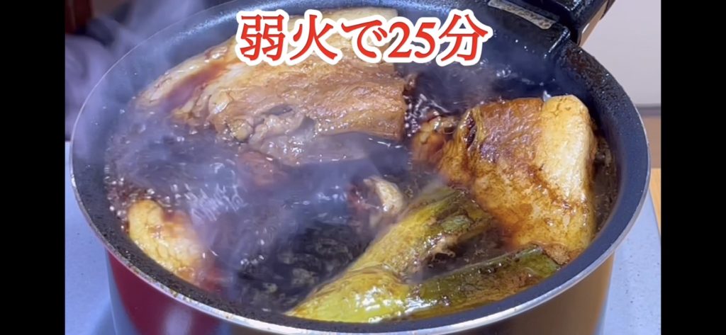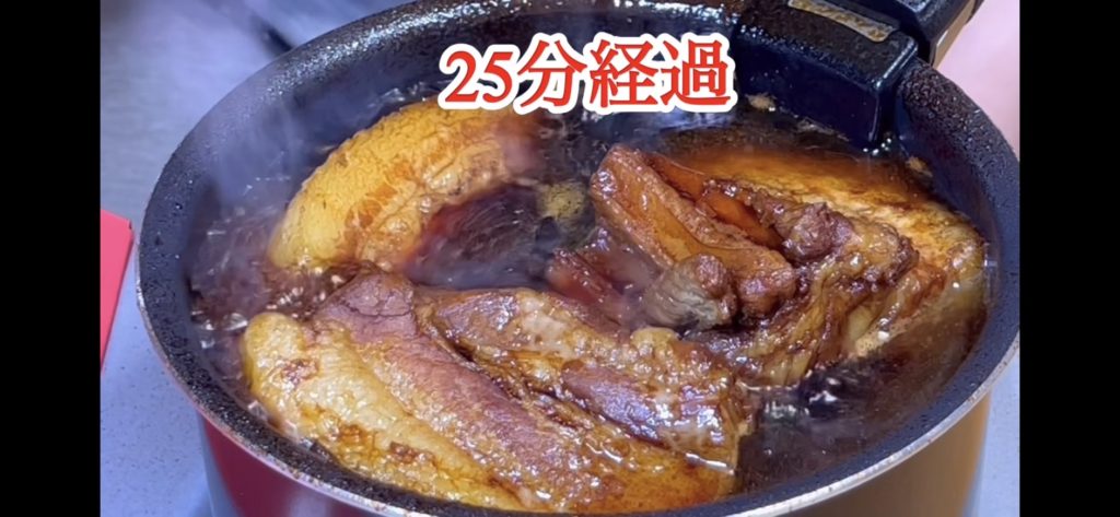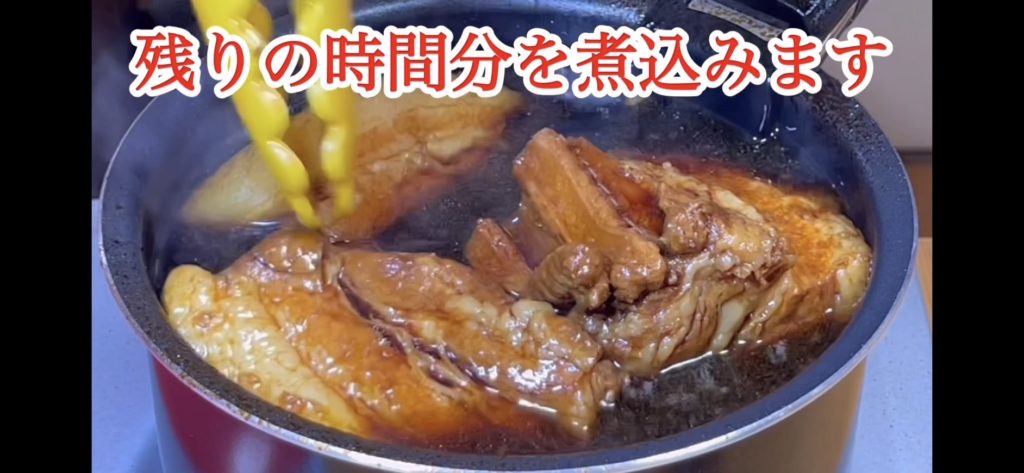 半分の時間で、チャーシューを裏返しにして下さい。そうすることで、均等に煮込めます。