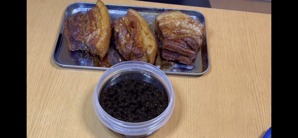 時間が経ったら、チャーシューを取り出します。チャーシュータレは、少し残しておくと味玉やチャーシュー丼などに使えます。