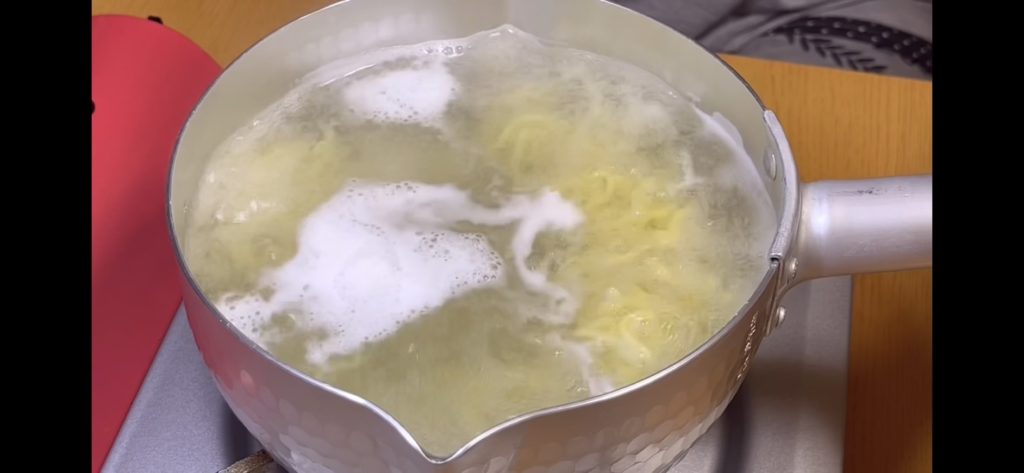 麺を茹でます。袋の表記に従って茹でて下さい。湯切りはやって下さいね。