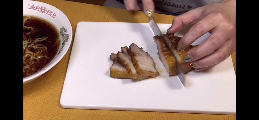 チャーシューを切ります。一番切れる包丁でザクザク切るのがお勧めです。味玉は、卵を8分茹でてから、チャーシュータレに十分ほど漬けておくと出来ます。ネギやメンマもあると最高ですね。写真は味玉にはしてません。